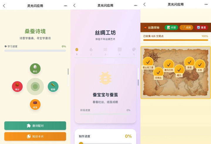早在今年2月,杭州绿促会已联合灵光App发起了“手搓环保科普小海报+小应用”的活动。杭州小学生用灵光手搓了“蚕树养护记”、“蚕的一生”、“养蚕秘境”、“丝绸工坊”、“丝路探秘”等桑蚕丝绸主题小应用,把桑树养护过程,蚕的蜕变过程以小游戏的方式呈现,还有把桑蚕和诗词结合,丝绸贸易历史地理知识和打卡方式结合,在互动过程中学习相关知识,趣味性、互动性得到极大提升。